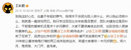 评论区有人询问《剑心雕龙》目前的进展,工长君回复称:“正在推进开发,整体品质也比年初时更好”,他还说:“对我来说,最重要的是比半年前是否更好,团队的关键岗位是否补齐,核心成员是真心热爱单机,还是只想安稳过日子。大家不要浪费彼此时间,也别装作热爱单机来忽悠人。”