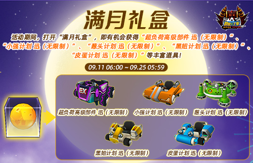 除通过<满月碎片组合活动>外,车手们还可直接在商店内兑换“满月礼盒”、在9月11日至9月17日每日20:00、21:00触发亦可获得“满月礼盒”~