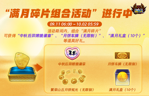 本次更新后至10月2日05:59期间,<满月碎片组合活动>限时开启!组合不同数量的“满月碎片”可获得包括“满月礼盒(10个)”(注:此道具在活动期间内仅可兑换5次)、“月饼车牌(无限制)”、“中秋后羿嫦娥徽章”、“繁荣山丘月饼炫光(无限制)”等在内的丰富道具!