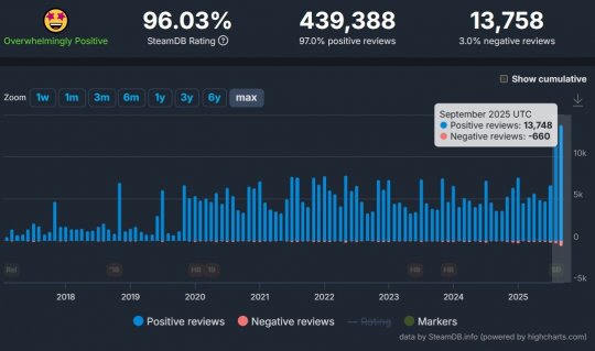 本作Steam好评数近44万条,而差评数至今不足1.4万条。但今年9月前十天收到的差评数量,已超过其历史上任何单月差评总数。根据SteamDB数据,9月前十天内《空洞骑士》收到660条差评。虽然这个数字看似微不足道,但已是其单月差评量的历史最高值(目前仅统计了三分之一月份),且远超8月刚创下的378条差评纪录。此前单月差评峰值出现在2025年1月(340条)。