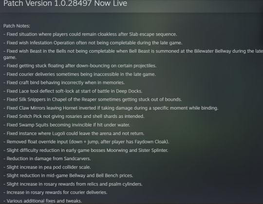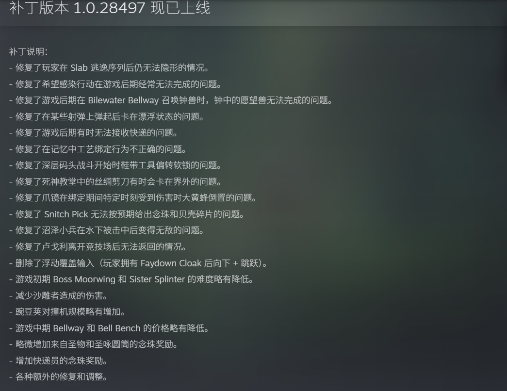 此前,我们报道过,《空洞骑士:丝之歌》于9月9日发布游戏发售后的首个补丁详细情况,并计划于下周上线,不过樱桃组似乎加快了步伐,将本次补丁提前发布了。