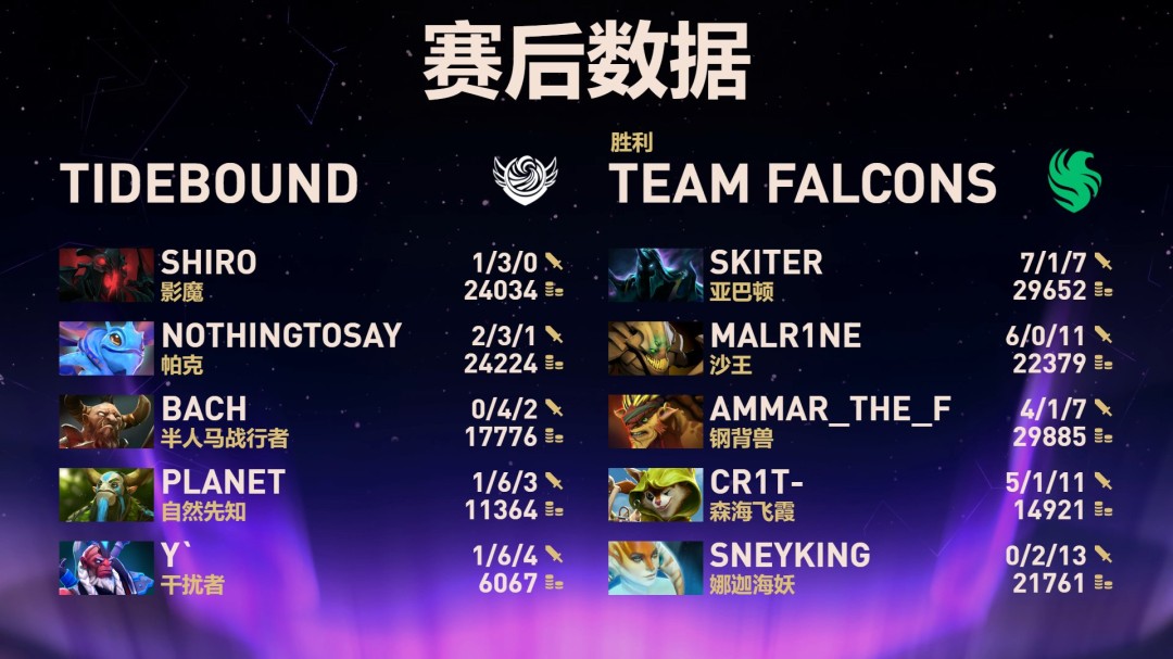 Tidebound战队状态调整明显不如对手Falcons,尽管在第一阶段曾战胜过这个老对手,但此次却以0-2败下阵来。根据赛程安排,Tidebound将于北京时间9月12日19:00在败者组首轮对阵BB与Nigma之间的败者。