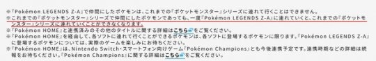 ·与《Pokémon HOME》联动让旧作自己喜爱的宝可梦重新回归会给玩家带来极大乐趣,但是官方提醒玩家,从旧作带回的宝可梦一旦在《宝可梦传说Z-A》落户,将无法回到原系列,玩家需要慎重考虑。