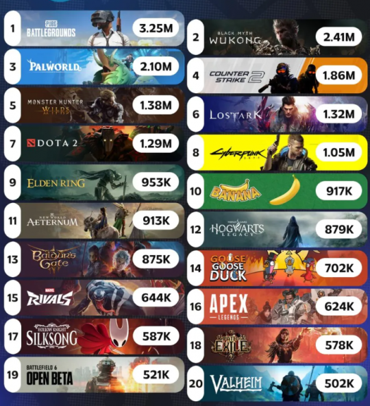 如图所示,Steam平台历史玩家峰值前20的游戏中,有11款为单人游戏。