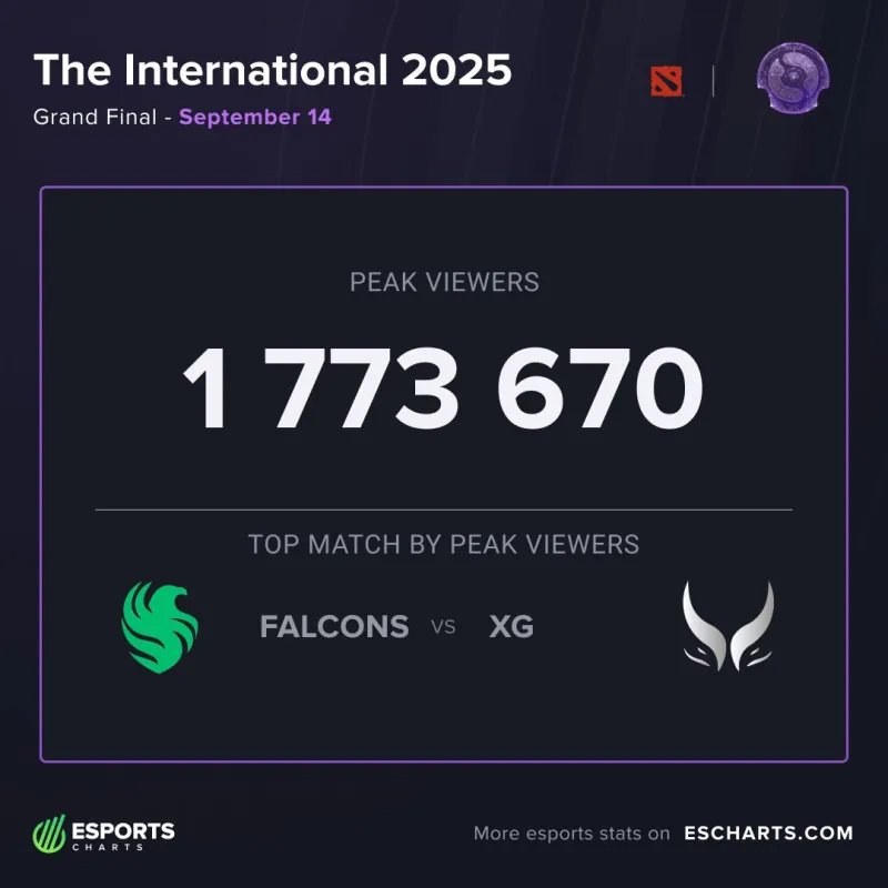 据国外权威数据统计平台Esports Charts最新发布,2025年DOTA2国际邀请赛(TI14)总决赛观众峰值达到177万人,创下本年度所有DOTA2赛事中的最高观看纪录。