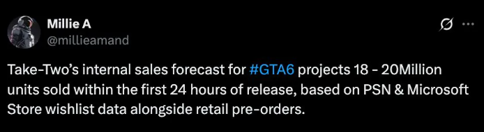据内部人士Millie A表示,这一预测基于PSN与微软商店的愿望单数据及实体版预购情况。若达成目标,《GTA 6》将创下行业新纪录——作为对比,十年前推出的《GTA 5》首发日销量约为1100万份。