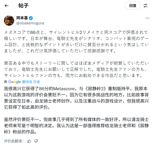 冈本基在X平台回应称,他对评分结果“感到激动”,同时也承认战斗设计的争议性,并特别称赞由著名作家龙骑士07担纲的剧本创作。他表示:“我很高兴本作获得了86分,与《寂静岭2:重制版》持平。以日本为舞台,由龙骑士07负责剧本,再加上以战斗为核心的设计,我原本预料可能会引发分歧,但非常感谢能获得如此高的评价。”
