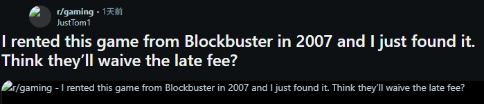 ·JustTom1玩家日前收拾地下室,找到了一款2007从Block buster连锁店租借的游戏《KANE&LYNCH: DEAD MEN》,忍不住发帖,感慨如今再还的话不知道得交多少滞纳金。