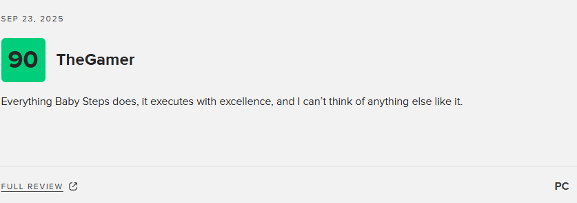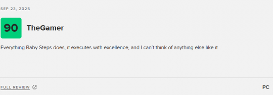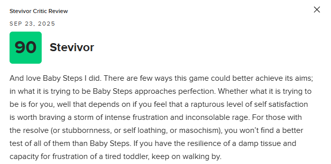 而我确实深爱上了《一步一脚印》。这款游戏几乎没有更好的方式来实现它的目标——在它想要成为的样子上,《一步一脚印》已经接近完美。至于它究竟是否适合你,则取决于你是否认为“极度的自我满足感”值得去承受“一场强烈挫败与无可慰藉的愤怒风暴”。对于那些意志坚定(或者固执、厌己、抑或有点受虐倾向)的人来说,没有比《一步一脚印》更好的考验了。可若你像一张湿纸巾般脆弱,或像疲惫的幼儿般容易因挫折而崩溃,那还是趁早绕道吧。