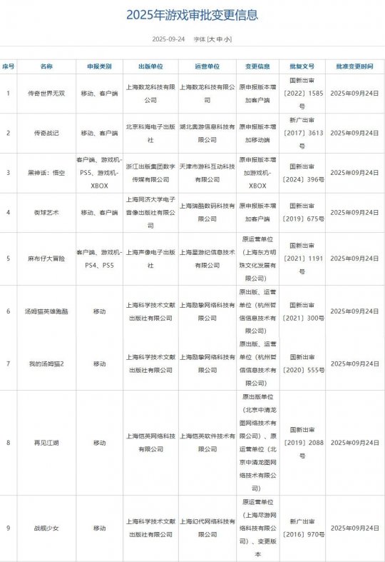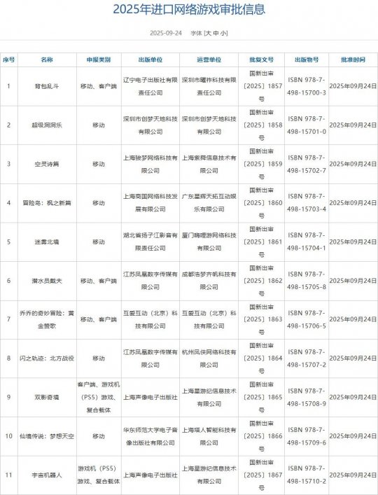 2025年9月国产游戏、进口网络游戏过审以及网络游戏审批版号发布,其中包括《崩坏因缘精灵》等145款国产游戏获批。而进口游戏方面热门合作游戏《双影奇境》、热门独立游戏《潜水员戴夫》、PS5免费发布游戏《宇宙机器人》等11款进口网络游戏过审。此外,国产动作游戏《黑神话:悟空》变更审批信息,新增游戏机Xbox。