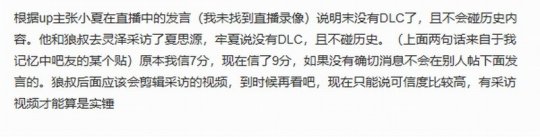 在评论区里,知名游戏区UP主中年玩家张小夏发言,称《明末:渊虚之羽》不会出DLC了,此题已结束。之前张小夏还与狼叔一起采访了夏思源,夏思源称《明末》没有DLC,且不碰历史。