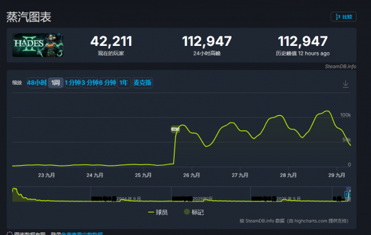 截至今日(9月29日),据数据网站SteamDB显示,《哈迪斯2》最高在线人数高达112947人。