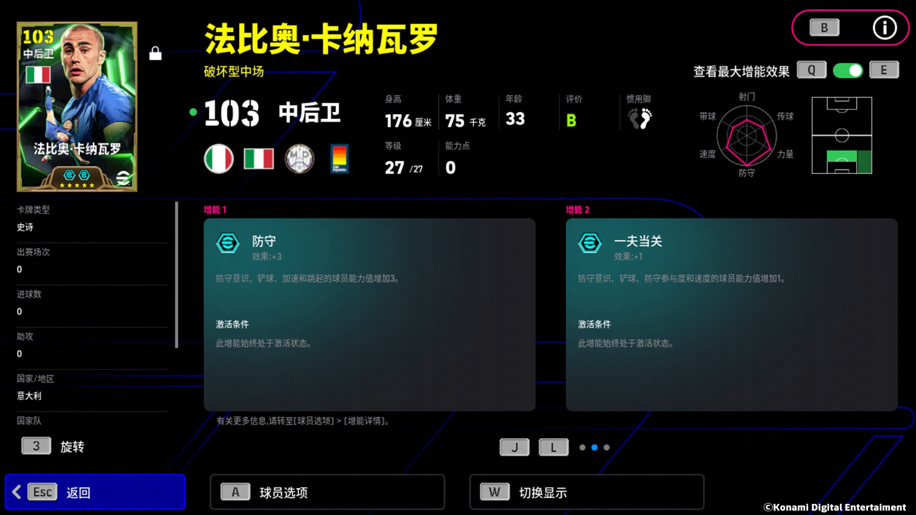 卡纳瓦罗的增能属性为【防守 +3】,让这位金球后卫成为前锋的梦魇!