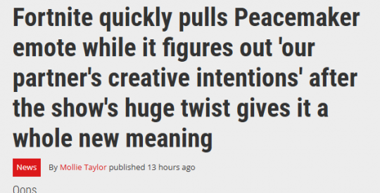 Epic Games日前宣布,已经删除了联动人气反超英美剧《和平使者》经典动态情感道具,具体原因或因为剧透。