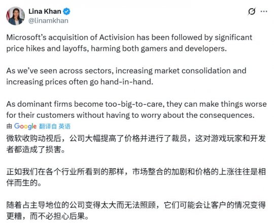 律师Lee Hepner在社交平台上引用微软此前声明,其中承诺收购完成后不会上调XGP价格。但他同时分享图表显示,自收购完成以来XGP价格上涨幅度明显加剧,并指出时任FTC主席Lina Khan的预警完全正确。这位前主席转发了该推文并补充道,收购案确实给玩家和开发者带来了负面影响,“市场垄断程度加深与价格上涨往往相伴相生”,且“垄断企业”完全可能肆无忌惮地损害消费者权益。