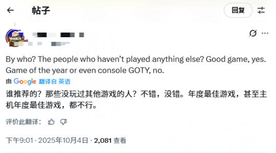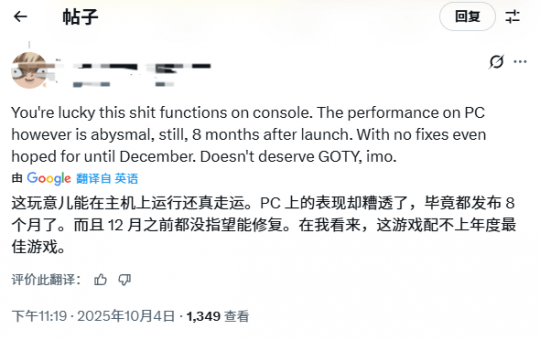 也有玩家直言:“这玩意儿能在主机上运行还真走运。PC 上的表现却糟透了,毕竟都发布 8 个月了。而且 12 月之前都没指望能修复。在我看来,这游戏配不上年度最佳游戏。”