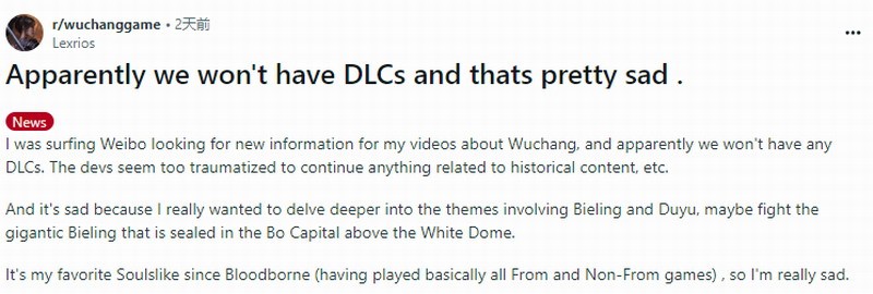 该消息也被转至Reddit论坛,引来众多老外围观。网友Lexrios发帖称,如果《明末:渊虚之羽》没DLC消息是真的话,那将是一件让人很难过的事情。