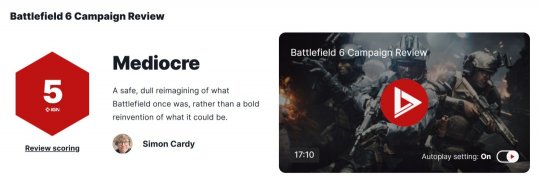 《战地6》单人战役获得IGN 5分评价,IGN指出《战地6》的单人战役只是一次对过去《战地》单人战役的重复,多人模式尚在评测过程中。在Metacritic上,根据51家媒体评测,PS5版综合均分84分。