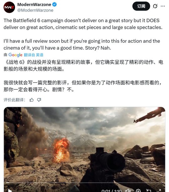 《战地6》的单人战役共9个任务,仅5个小时流程,《战地6》的战火燃得不久,也不耀眼。它在视觉上偶尔令人震撼,听觉上也颇具享受,但在任务设计和剧情张力上却完全乏善可陈。虽然能带来一个下午的短暂乐趣,但它只是对昔日《战地》的一次安全重塑,距离一场大胆的革新——一种它如今本应达到的蜕变——仍有很远的距离。