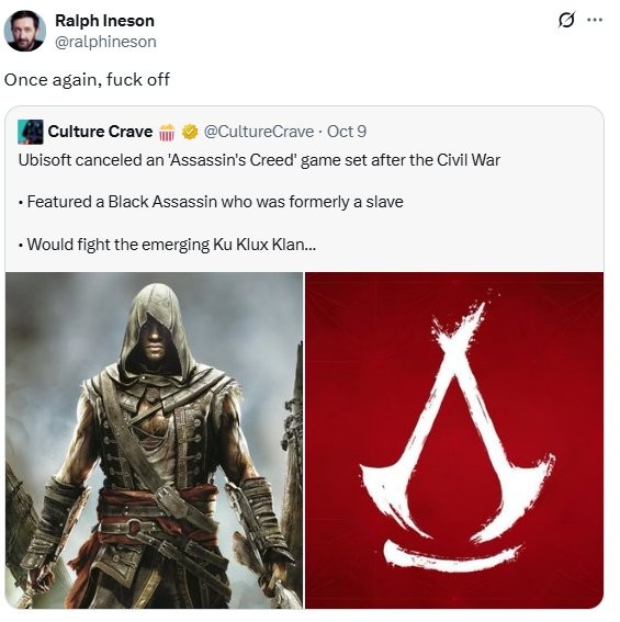 此举引发玩家群体强烈不满。许多人既因育碧疑似向种族主义者妥协而愤慨,又为这个充满潜力的题材被弃用感到失望——这似乎成了育碧讨好反对派的手段。更值得注意的是,业界人士也加入了批评行列——一位曾参演《刺客信条》系列的演员就此发声。