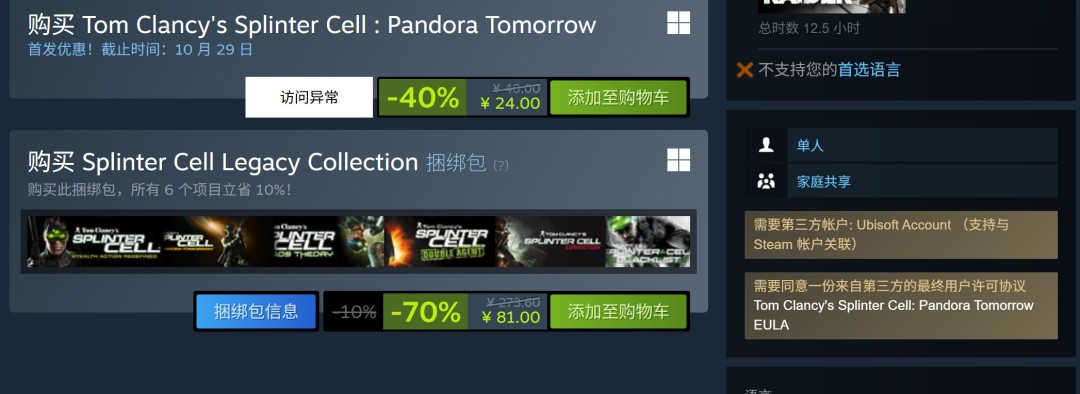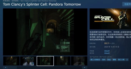 由育碧上海开发的《细胞分裂2:明日潘多拉(Tom Clancy's Splinter Cell: Pandora Tomorrow)》登陆了Steam平台发售,国区发售特惠24元,无多人模式和中文。