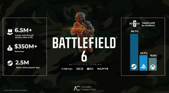 根据数据分析公司Alinea Analytics的最新报告,《战地6》在正式发售四天多的时间内,全球销量已突破650万份,创收约3.5亿美元。该作在Steam平台的并发玩家数曾达到74万,目前PC玩家占比高达57%,成为该作的主力用户群体。