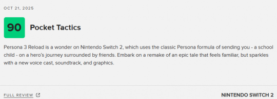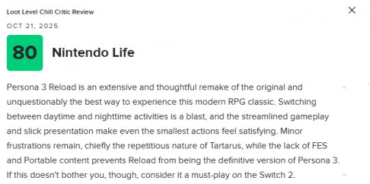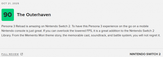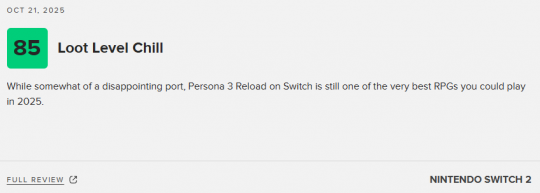 由Atlus开发的日式rpg《女神异闻录3:Reload》即将登陆Switch2平台。本作的Switch2版媒体评测已经正式公开,截止发稿前,本作NS2版本的均分为79分,共收录22家媒体。