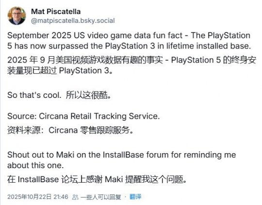 根据市场研究公司Circana的分析师Mat Piscatella在社交媒体上公布的信息,截至2025年9月,PS5在美国的销量已正式超越PS3。尽管未公布具体数字,但这一成就意味着PS5在上市不到五年的时间里,就在美国市场超越了PS3长达十年的销售积累。
