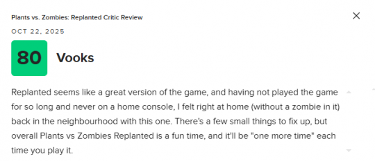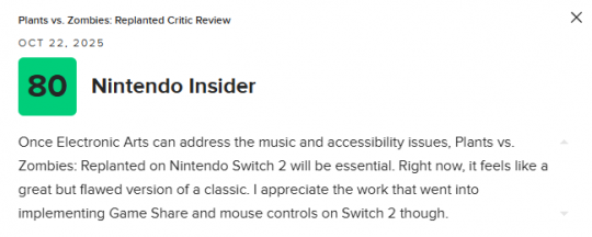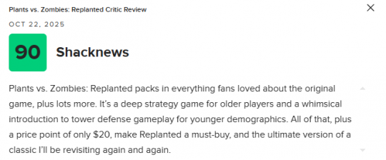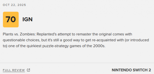 《植物大战僵尸:重植版》即将正式发售,该作的媒体均分也已解禁。目前NS2版本M站均分为76分,共收录9家媒体,其中IGN打出了7分的评价。