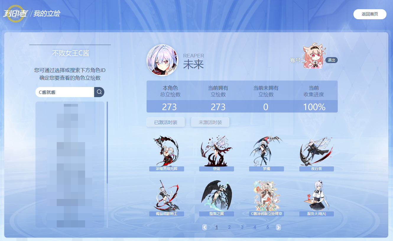 近1个月内有登录过游戏的玩家,进入立绘站首页,点击右上角“我的时装”按钮即可查看,账号下每个角色收集的时装都会单独显示,当前游戏内已激活和未激活的立绘会以缩略图展示,方便查缺补漏。