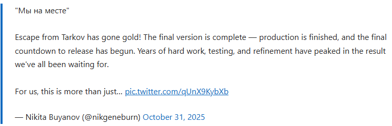 Battlestate Games工作室老大,Nikita Buyanov于10月31日发X宣布,《逃离塔科夫》终于正式开发完毕,已经进入正式发售的倒计时,预定11月15日登录Steam,敬请期待。