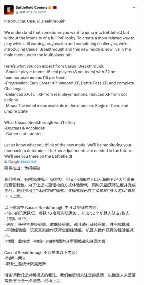DICE通过最新更新为《战地6》新增了“休闲突破”模式,玩家可通过多人模式核心菜单访问该模式。新模式的设计目的是为新手玩家提供更舒适的入门,让他们在与电脑AI敌人战斗的同时提升等级。