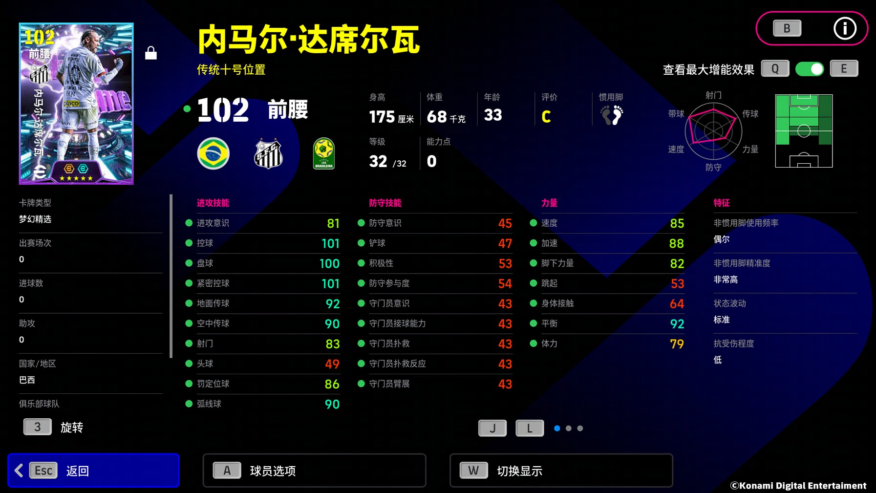 内马尔拥有【全面提升 +3】的增能,阵容中拥有20名或以上的巴西联赛、巴西乙级联赛的球员时,可以获得+3的增能。内马尔还自带【无定型传球】的特殊技能,搭配他92分地面传球和90分的空中传球,即使面对围追堵截,他也能用巧妙的脚法将球精准传到队友脚下!