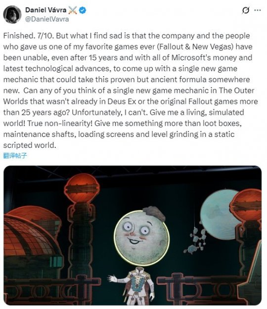 丹尼尔·瓦夫拉说:“通关《天外世界2》了,我打7分(满分10分)。让我感到遗憾的是,黑曜石团队(《辐射:新维加斯》我很喜爱)在微软资金支持和最新技术加持下,15年过去了,却仍没能想出哪怕一个新的游戏机制,让这套成熟但陈旧的模式焕发新生。”