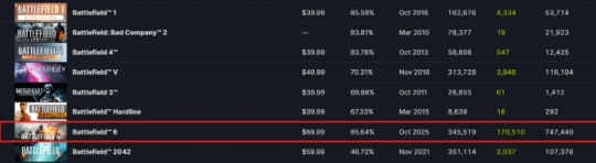 根据SteamDB数据显示,截至发稿时《战地6》全球好评率已跌至65.64%,不仅远低于系列平均水平,甚至落后于因偏离系列传统而备受争议的《战地:硬仗》,同时简体中文评价也为多半差评,好评率仅有32%。若开发团队未能及时扭转局面,游戏极有可能创下系列最低评分纪录。