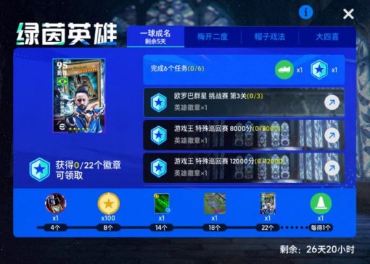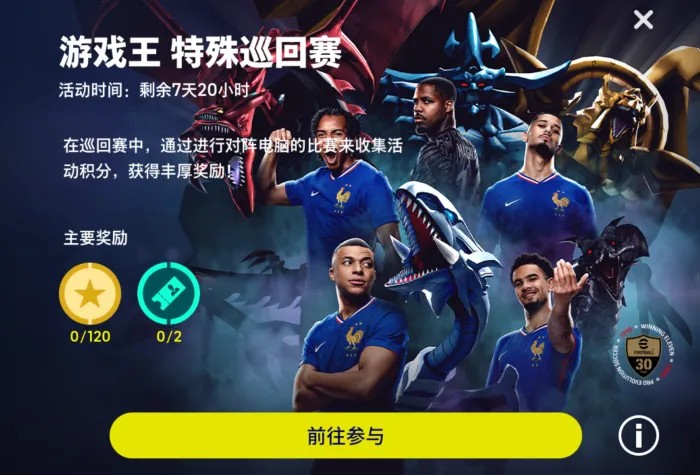 集齐一定数量的【奖章】,你将有机会获得【游戏王 联动精选内马尔】、【游戏王 自选精选经纪人】、【黑魔导臂章】、【黑魔导-进球投影】、【金币】等道具奖励!