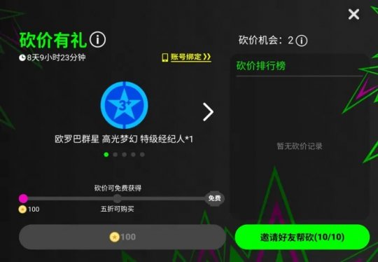 在【砍价有礼】期间内,玩家可以通过分享链接,邀请其他玩家砍价,以降低奖励的购买金币。分享达到一定的次数,还可以免费额外获取奖励,最多可获得13抽【欧罗巴群星 高光梦幻 特级经纪人】!