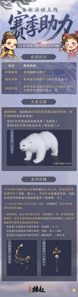 多重活动同步开启,参与各玩法可获得额外奖励,助力侠士加速成长!签到活动今日上线,满20级侠士签到可领取各类数值奖励,更有奇趣坐骑「北极熊」、七级五行石(绑定版)赠送惊喜!