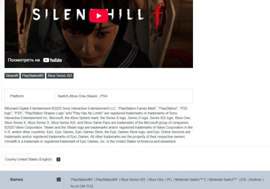 在科乐美的官方网站中,点击游戏分类并选择《寂静岭f》页面,可见Switch与旧主机版本的相关信息。这些信息在页面中出现了两处:其一是“平台”栏目明确列出“Switch、Xbox One、Steam、PS4”;其二在“游戏”分类中罗列着PlayStation 5、PlayStation 4、Xbox Series X/S、Xbox One、PC、Nintendo Switch 2、Nintendo Switch、iOS、Android等平台,甚至意外出现了“游戏王卡牌”选项。