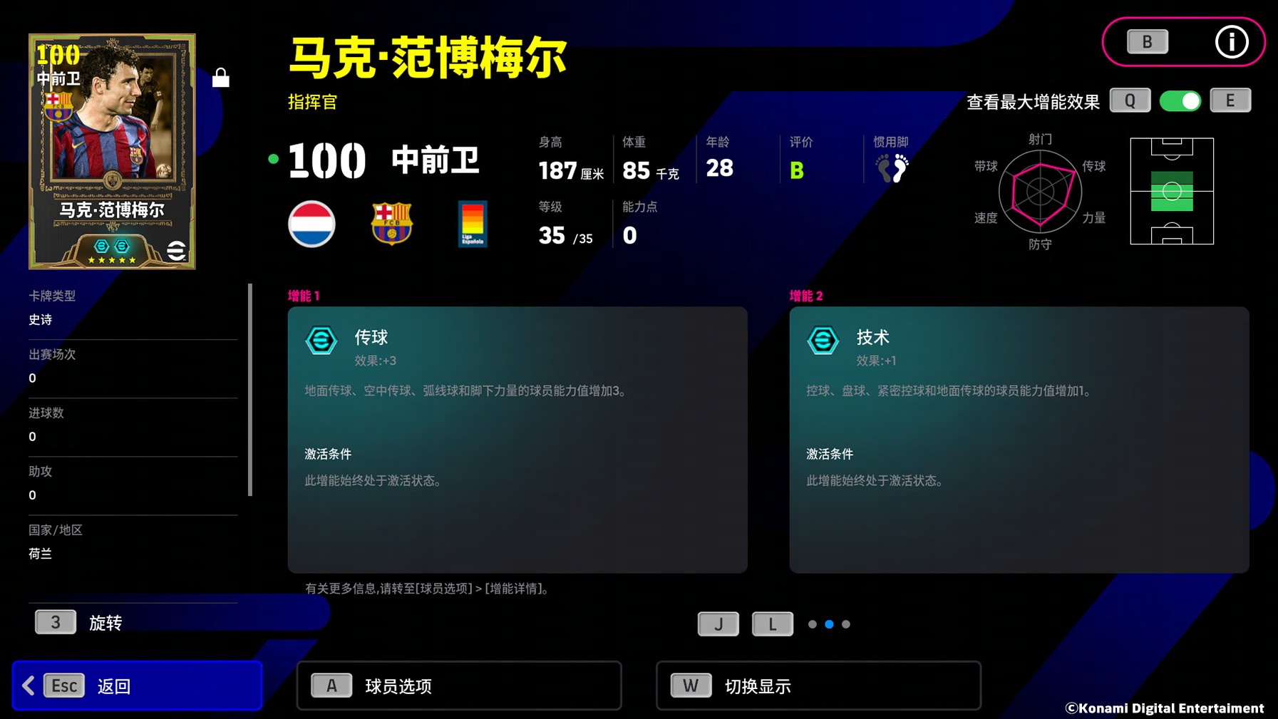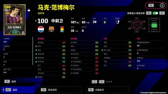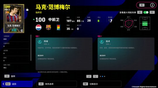 范博梅尔的增能属性为【传球 +3】,这位红蓝指挥官在中场运筹帷幄,梳理球队的进攻路线!