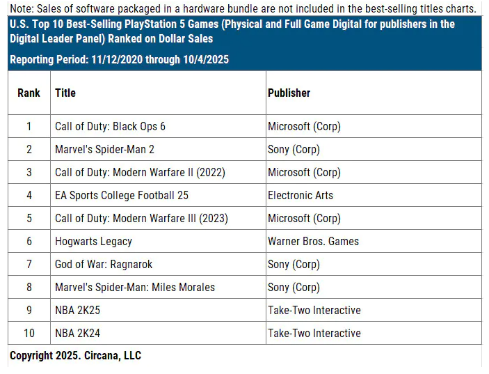 值得注意的是,在此份以美元销售额为基准的榜单中,索尼第一方作品仅有三款入围:位列第二的《漫威蜘蛛侠2》、以及《漫威蜘蛛侠:迈尔斯·莫拉莱斯》与《战神:诸神黄昏》。这一方面印证了《使命召唤》系列在PS5平台的绝对统治力,另一方面也暴露出索尼在持续运营类与多人游戏领域的明显短板——此前《星鸣特攻》的失败便是最新例证。