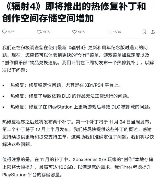 《辐射4》周年纪念版的开发商贝塞斯达工作室(B社)宣布将发布一系列补丁,旨在解决该纪念版所面临的批评。首个补丁预计将于下周发布,主要解决几个关键问题:加快Creation Club内容的加载速度、提升上世代主机平台的稳定性,并修复扩展包中模组相关的问题。