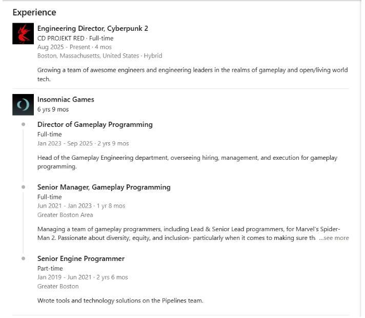 根据领英上的信息,Jess将领导一支工程师团队,在CD Projekt Red波士顿分部开发《赛博朋克2》。这位总监此前曾在Insomniac Games工作近7年,参与开发了多个系列经典游戏。