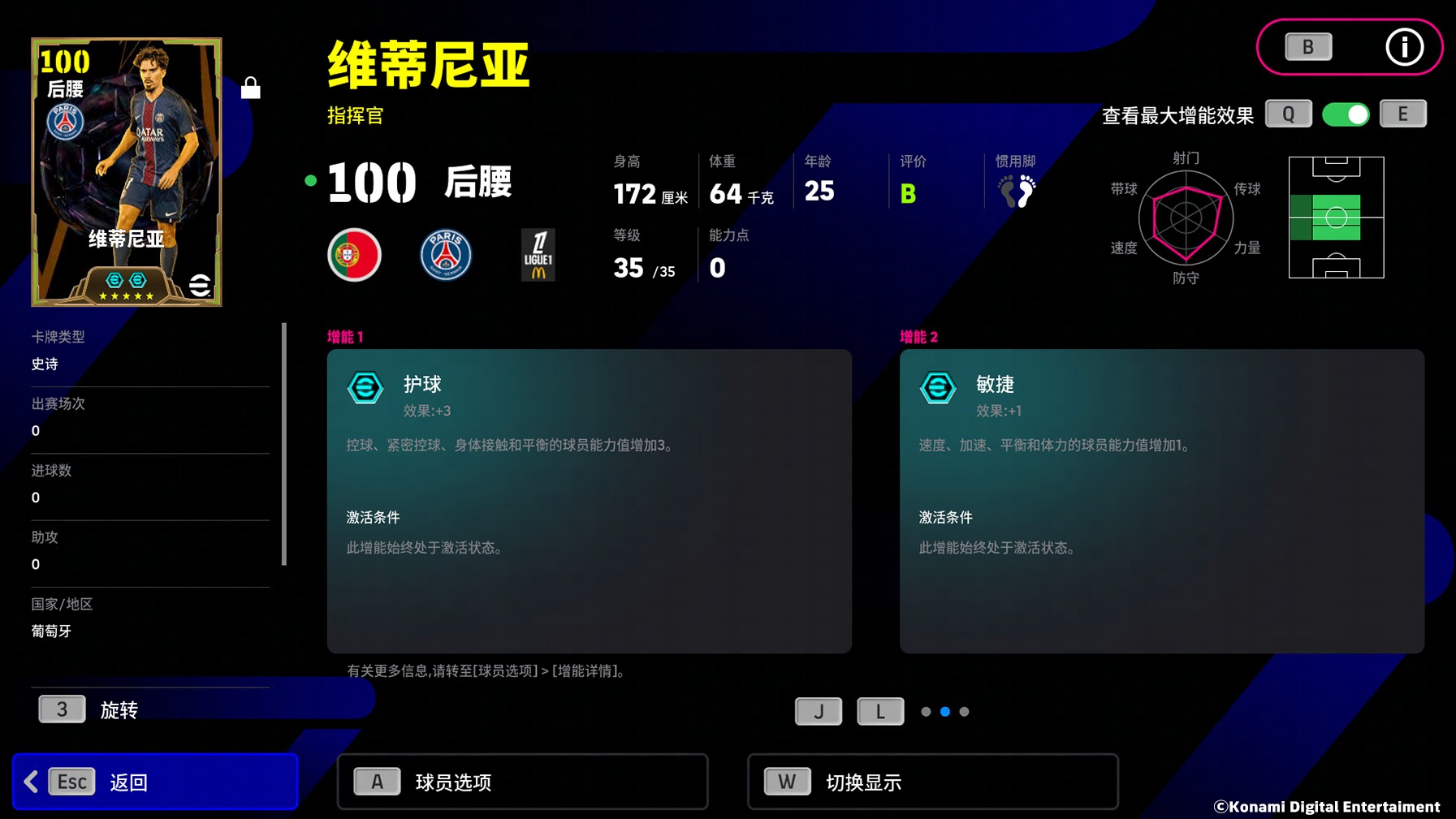 维蒂尼亚拥有【护球 +3】的增能加成,身体接触和平衡的增强让他在中场掌控球队节奏!他还自带【无定型传球】,让他可以在非常规的姿势下传出精妙的传球!