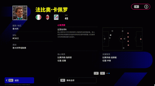而在实况赛场上,卡佩罗长传反击和长传球的风格均为89分,他还能为球员提供【射门+1 防守意识+1】的增能属性。不仅如此,他还有【过顶长传A】心有灵犀。玩家可以设置比赛风格为【指挥官】的后腰球员作为核心球员,比赛风格为【偷猎者】的中锋球员为关键球员。当核心球员在己方半场持球时,关键球员会积极前插。核心球员传给关键球员的直传球和高空直传球质量,以及关键球员的停球精准度均会提升!