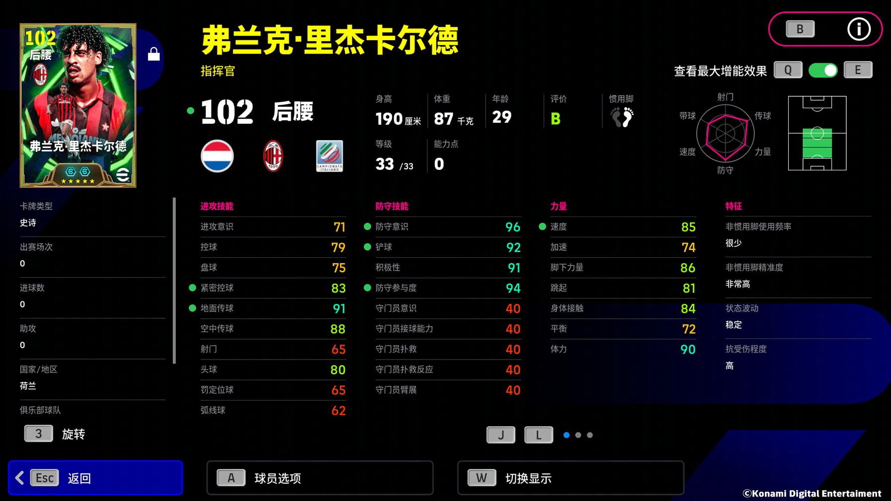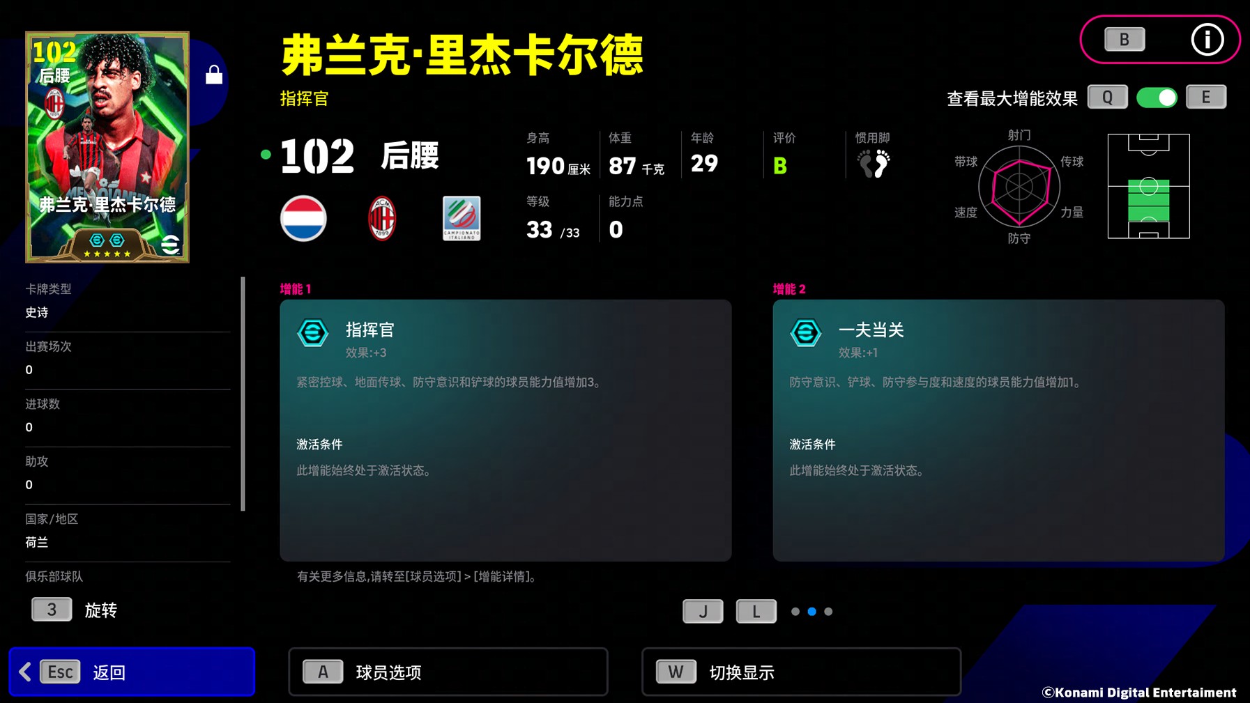 里杰卡尔德是“荷兰三剑客”中的最稳定的屏障,也是米兰王朝不可或缺的攻防枢纽!防守时,他如铜墙铁壁般坚不可摧,总能精准截断对手的攻势;进攻时,他又化身后场发动机,以一记记精准长传策动反击,为前插的队友送上远远不断的炮火支援!