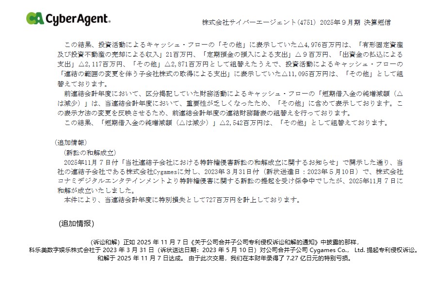 《赛马娘》开发商Cygames的母公司CyberAgent近日宣布,因与科乐美达成诉讼和解,将在本财年计入7.27亿日元(约合470万美元)的特别损失。该信息源自该公司11月14日发布的年度财务简报。