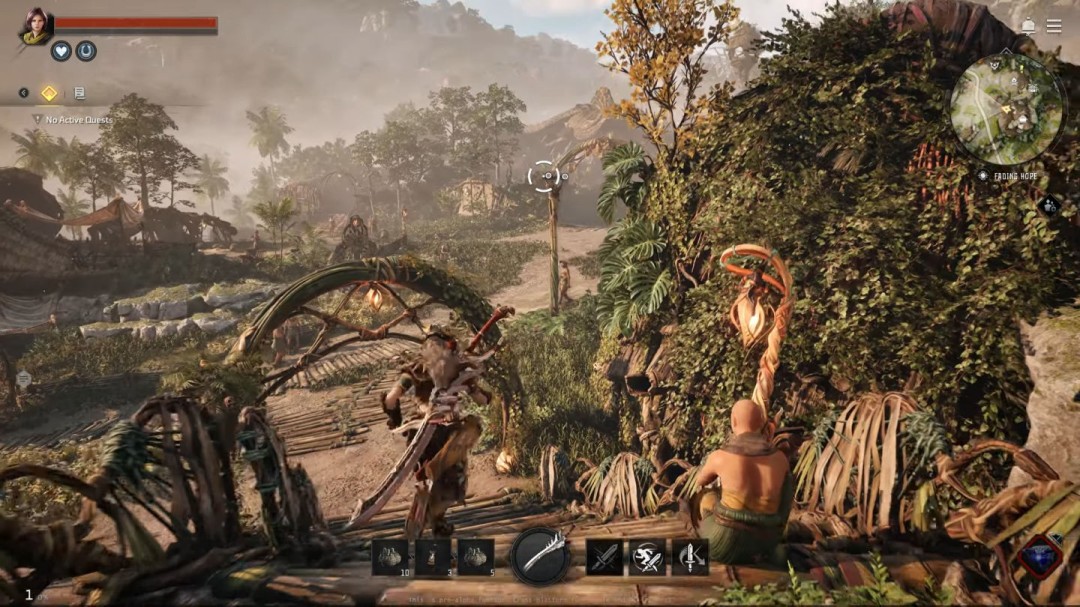 《地平线》原作是一款使用弓箭佔比几乎80%-90%的游戏。但只用弓和矛来套用在MMORPG上,在概念上不太合理。所以他们初期在和索尼(Guerrilla)进行协商时,将比重定为50%的近距离战斗与50%的远距离战斗。除了像矛和弓之外,团队还制作了近距离六种、远距离六种武器。除预告中看到的大剑、双剑,远距离武器不只有弓,还有像弩弓之类的独特武器。