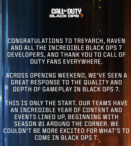 在首发周末期间,我们见证了玩家对《黑色行动7》游戏品质与玩法深度的高度认可。这仅仅是个开始。我们的团队已规划好全年精彩的更新内容与运营活动,首轮季前赛即将拉开序幕。对于《黑色行动7》未来的发展蓝图,我们怀抱着前所未有的期待。