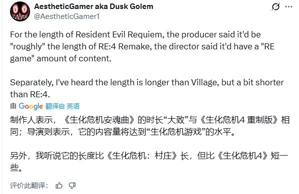 目前官方尚未透露《生化危机:安魂曲》通关平均时长的有关信息,不过知名爆料人Dusk Golem提供了些许线索。
